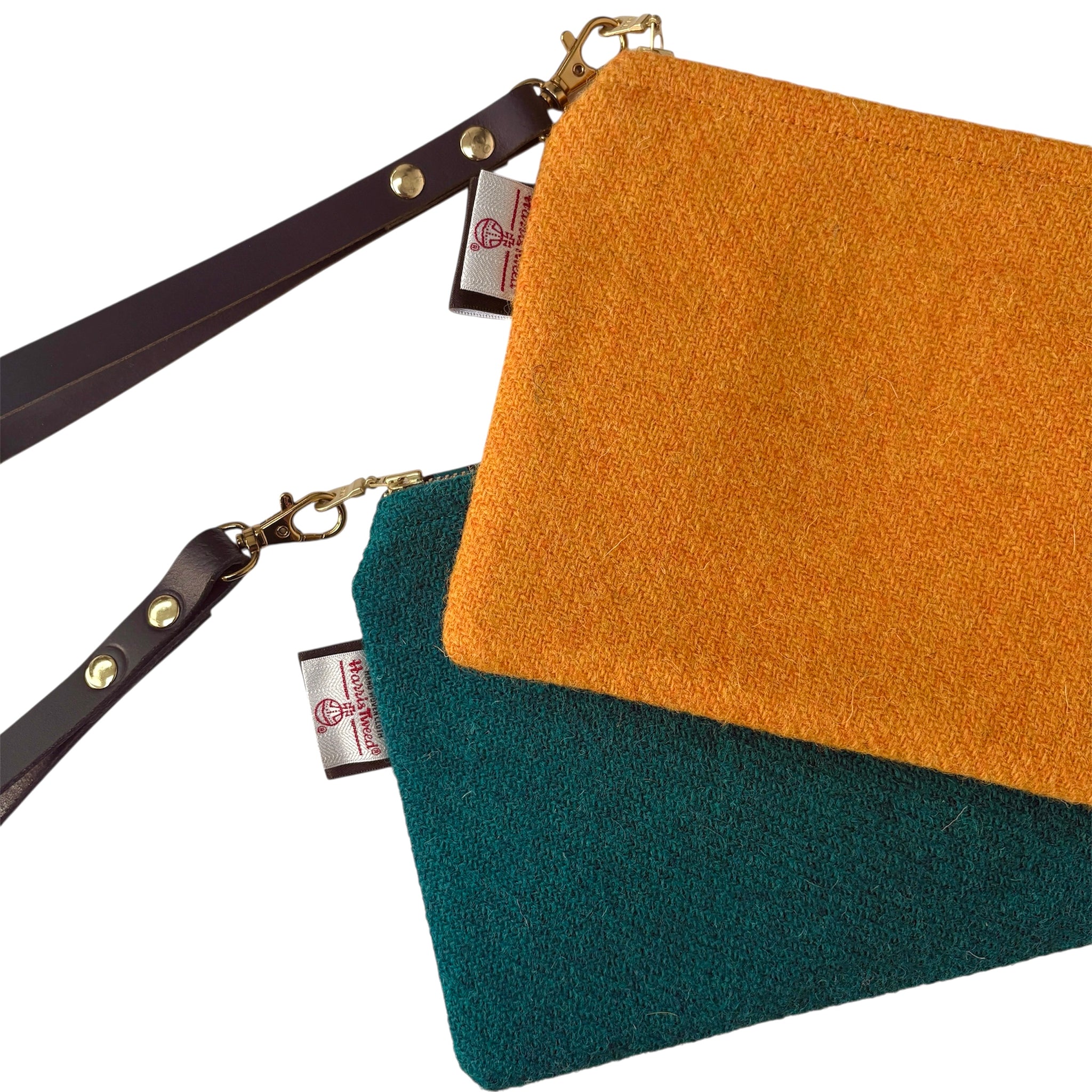 These Clutch Bags have been made from Harris Tweed that has been sourced directly from the Hebrides and soft leather. The 100% wool fabric is rich in colour due to the nature of the yarn dying processes applied during production. Inspired by nature, the design has been individually silkscreen printed by hand and the finished piece has been lined with cotton fabric. Each Clutch Bag has a leather wrist strap and a brass zip fastening.