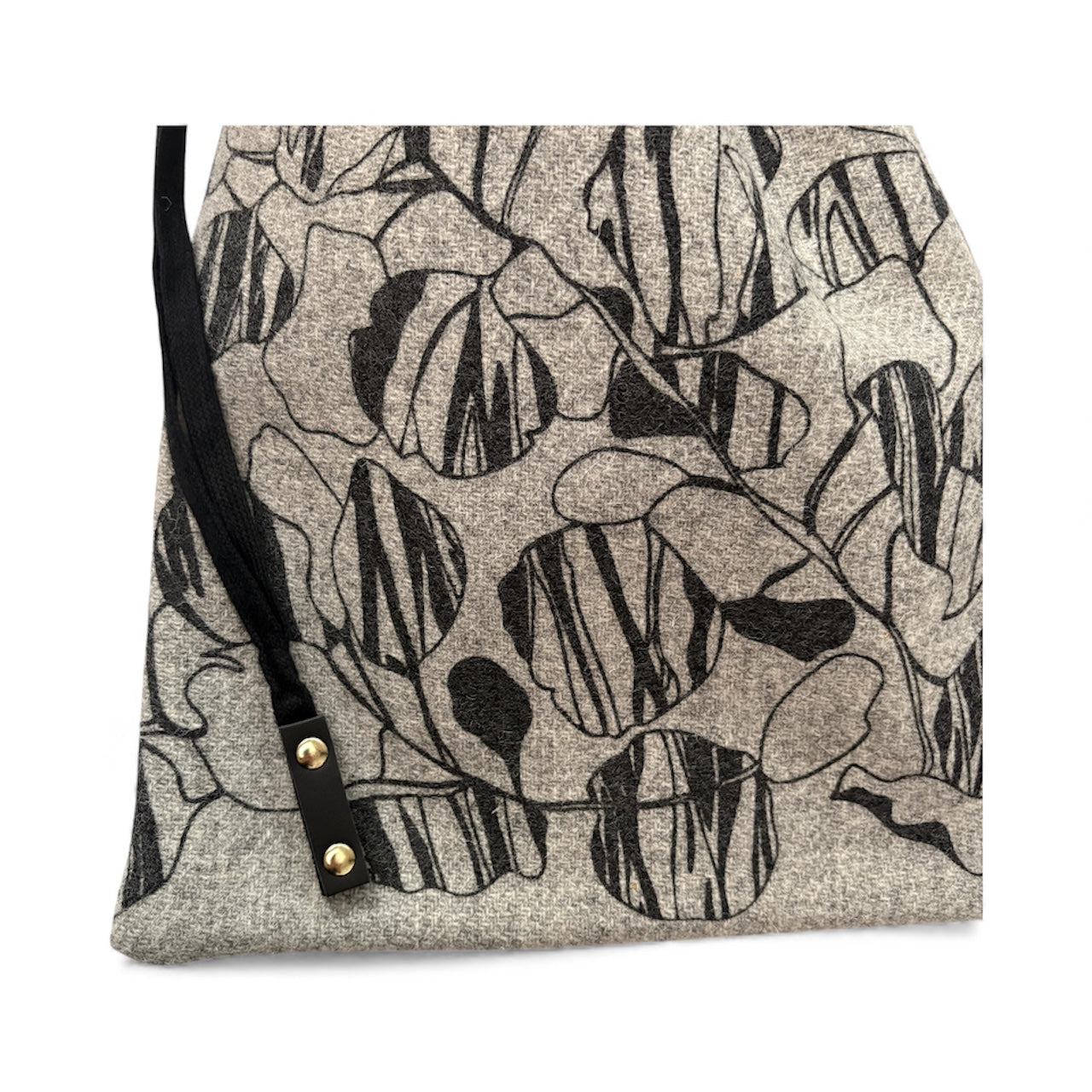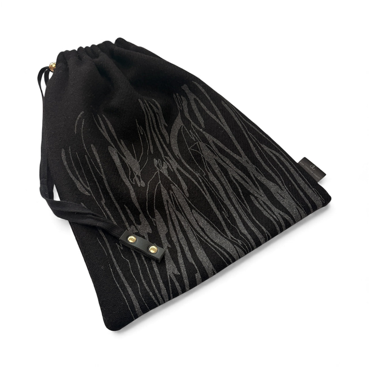 Silkscreen Printed Harris Tweed Drawstring Bag. The 100% wool fabric is rich in colour due to the nature of the yarn dying processes applied during production. Inspired by nature, the design has been individually silkscreen printed the finished piece has been lined with cotton fabric. Each bag has a gold metal pull tab.